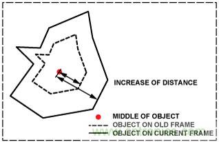 一旦物體位置及其邊緣已知,我們就可以試著進(jìn)行跟蹤。關(guān)鍵是從圖片中正確提取物體,將它的邊緣轉(zhuǎn)換成輪廓,然后用來判斷物體 是否在朝攝像頭移動(dòng),方法是檢查像素距物體中心的平均距離以便判斷物體尺寸是否在改變,如公式2所示