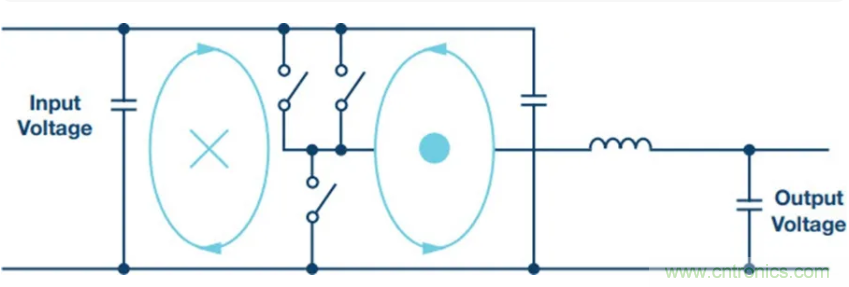 上圖顯示了走線和開關(guān)的對稱布局。這種布局將開關(guān)電流分為兩條對稱路徑。一條路徑產(chǎn)生的磁場強度與第二條路徑相同,但方向相反。所以,這些干擾磁場基本可以彼此抵消。