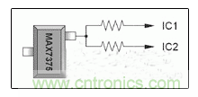 硅振蕩器在電路板上的布局通常沒有很高的要求,因為這種器件輸出的是低阻抗方波,它能夠在電路板上傳送足夠的距離,且無須顧慮其他信號對它的干擾。硅振蕩器能夠驅(qū)動多個器件。和任何其他高速信號一樣,硅振蕩器的時鐘輸出在驅(qū)動長導(dǎo)線時會產(chǎn)生電磁輻射。靠近時鐘發(fā)生器的引腳,在每路時鐘信號上串連一個電阻可以降低這種輻射。如圖4所示,MAX7375驅(qū)動兩路時鐘電路時,每條時鐘線上都串入了一個電阻。