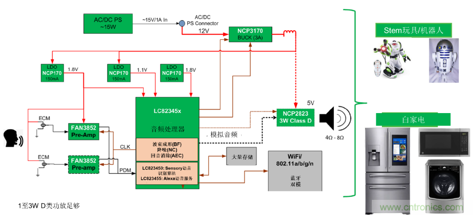 圖2所示為本地VUI方案的一個示例應用框圖及評估板。采用安森美半導體的超低功耗音頻處理單芯片LC82345X、麥克風預放大器FAN3852、低壓降穩(wěn)壓器(LDO)NCP170、同步PWM開關(guān)降壓穩(wěn)壓器NCP3170、單聲道音頻功率放大器NCP2823。安森美半導體憑借在電源管理的經(jīng)驗和專知,使這方案實現(xiàn)超低功耗,這是此方案與其他競爭對手方案相比的一個優(yōu)勢。現(xiàn)有的方案雖然未集成WiFi、藍牙雙模的模塊,但安森美半導體已收購了WiFi領(lǐng)袖Quantenna,已具備相關(guān)技術(shù),未來會考慮將WiFi模塊也集成進去。
