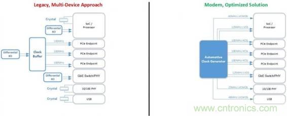 圖 1:時(shí)鐘樹實(shí)現(xiàn)——傳統(tǒng)的多器件方法 vs 最新的優(yōu)化解決方案。