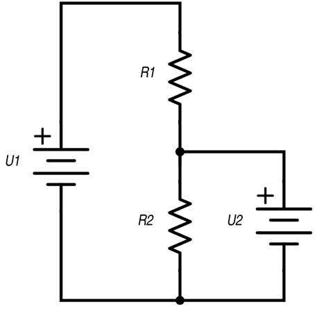 如果 U 1是 9V 電池,R 1是 3 歐姆電阻,R 2 是 6 歐姆電阻,則電路中流動的電流為