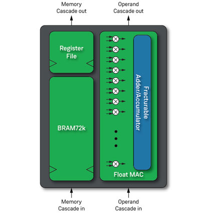在Speedster7t上搭載的機器學(xué)習(xí)處理器(MLP)是一種優(yōu)化的矩陣/向量乘法模塊,能夠在單個時鐘周期內(nèi)進行32次乘法和1次累加,是計算引擎架構(gòu)的基礎(chǔ)。AC7t1500器件中的Block RAM(BRAM)與2560個MLP實例都處于同一位置,這意味著更低的延遲和更高的吞吐量。