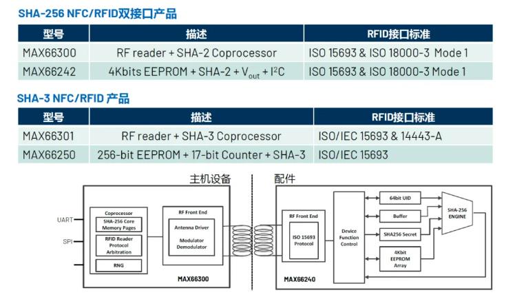 接口方面,提供接觸方式的1-Wire、I2C、SPI多種接口以及非接觸的NFC接口(如MAX66250),尤其是ADI獨(dú)有的1-Wire接口,僅通過一條線就可以實(shí)現(xiàn)供電、通信數(shù)據(jù)和時(shí)鐘的傳輸,最大程度地簡(jiǎn)化了主機(jī)設(shè)備和配件之間的機(jī)械和電氣設(shè)計(jì),降低了ESD保護(hù)和EMC的成本;