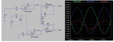 圖7.采用雙通道放大器的差分轉(zhuǎn)差分可調(diào)共模電路。右圖為輸入(紅色)和輸出(藍(lán)色和綠色)的LTspice仿真。