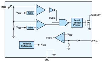 在圖6中,此類型窗口電壓監(jiān)控器使用內(nèi)部比較器根據(jù)輸入電壓(IN)和輸入電源電壓(VDD)來確定輸入條件。通過IN引腳分別為UVLO電平及被監(jiān)控電壓的OV和UV監(jiān)控VDD電平。如果IN超出預(yù)編程的UV/OV窗口,復(fù)位輸出將置位。基準電壓決定了各種工廠調(diào)整的標稱輸入電壓,以及符合給定閾值精度規(guī)格的廣泛輸入容差選項。容差根據(jù)編程的標稱輸入電壓設(shè)置UV/OV閾值水平。此外,該電壓監(jiān)控器在窗口閾值具有內(nèi)部滯回,可幫助避免噪聲引起的多重故障條件。