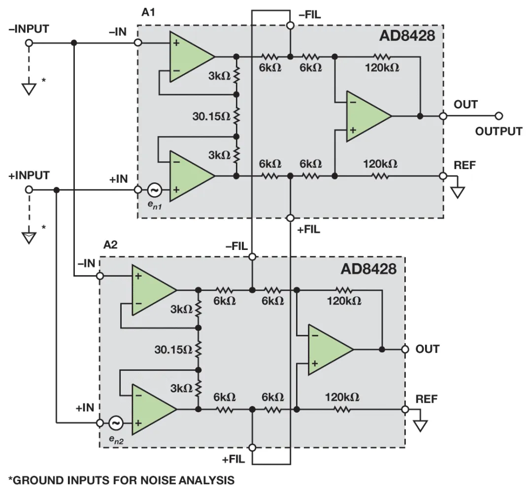 針對圖2電路簡化版本的分析表明,將兩個(gè)AD8428以此方式連接可以降低噪聲,降低的倍數(shù)為2。每一個(gè)AD8428的噪聲都可以在+IN引腳上建模。為了確定總噪聲,可以將輸入接地,并使用疊加來組合噪聲源。