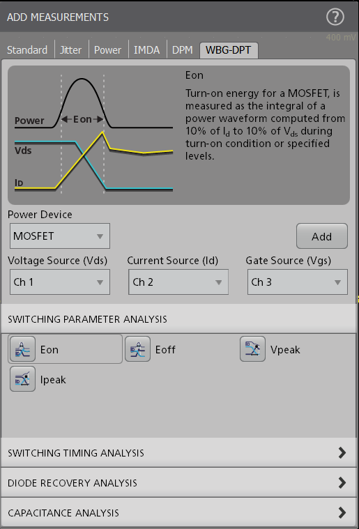 圖16:適用于4/5/6系列MSO的WBG-DPT選項,可自動化雙脈沖測試的測量,包括開關(guān)參數(shù)、時間、二極管恢復和電容分析。