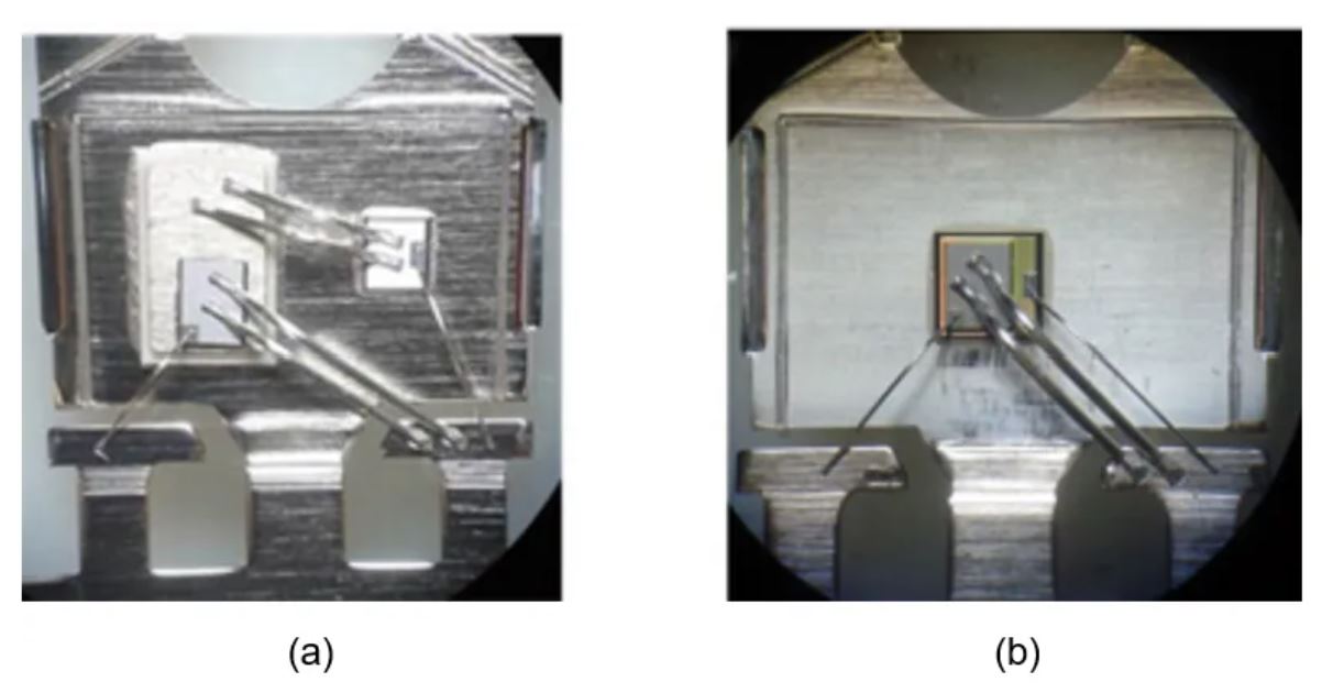 分立cascode 結(jié)構(gòu)采用并排芯片,如圖 2(a)所示,或堆疊芯片,如圖 2(b)所示。在這兩種情況下,SiC JFET 通常都是銀燒結(jié)在封裝引線框架上。