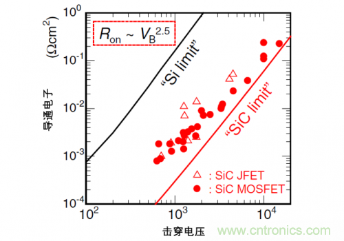 對于 Si 基功率器件,單極和雙極器件的分界線在 300~600V,而在 SiC 功率器件中,這個邊界向后移動了大約 10 倍的阻斷電壓,即幾 kV。預(yù)計 SiC 將在 300V~6500V 的阻斷電壓范圍內(nèi)替代 Si 的雙極型器件,并且 SiC 的雙極型器件在 10kV 以上的超高壓應(yīng)用中也是"魅"不可擋。