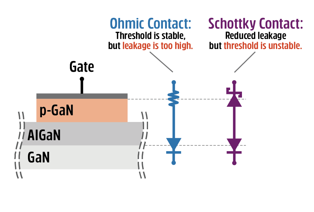 圖3 (a) Normally-off E-mode(P-GaN 柵極)結(jié)構(gòu),無柵極隔離。 (b) 示意圖顯示肖特基金屬接觸,產(chǎn)生危險的背靠背二極管,其間有浮動p-GaN層,導致動態(tài)閾值電壓Vth問題