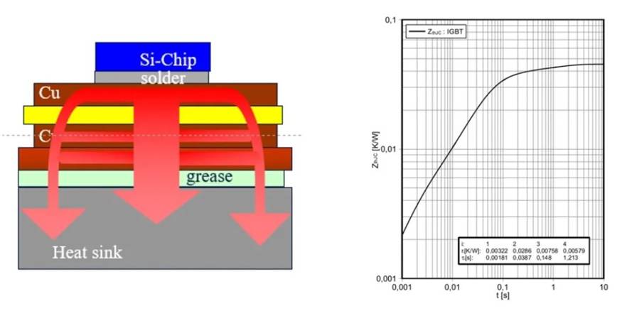功率半導(dǎo)體結(jié)對(duì)殼的瞬態(tài)熱阻抗Zthjc會(huì)在數(shù)據(jù)手冊中給出,功率半導(dǎo)體常見的封裝為帶銅基板功率模塊、不帶銅基板的DCB模塊和基于銅框架結(jié)構(gòu)的單管,由于傳熱通路的材料不同,材料重量體積不同,所以瞬態(tài)熱阻抗Zthjc不同。