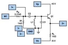 構(gòu)建調(diào)諧射極跟隨放大器的仿真原理圖如圖1所示。計(jì)算發(fā)射極電阻RL的值,使得NPN晶體管Q1中的電流約為5 mA。假設(shè)電路由±5 V電源(總共10 V)供電。提示:Q1基極的直流電壓由經(jīng)過L1到地的直流路徑設(shè)置。計(jì)算C1和C2的值,確保當(dāng)L1設(shè)置為100 μH時(shí),諧振頻率接近350 kHz。一般來說,C1和C2的值相等。在輸入端口執(zhí)行小信號(hào)交流掃描,并繪制在輸出處看到的幅度和相位曲線。保存這些結(jié)果,將它們與實(shí)際電路的測(cè)量結(jié)果進(jìn)行比較并將比較結(jié)果隨附在實(shí)驗(yàn)報(bào)告中。