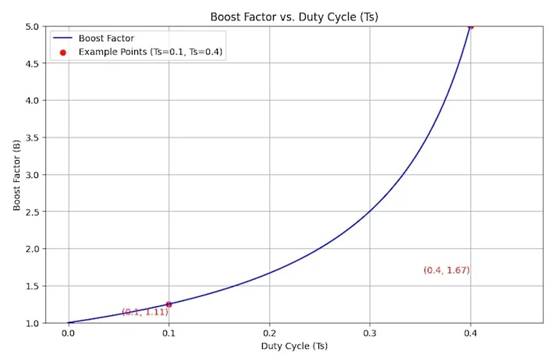 這意味著,隨著占空比的增加,升壓因子也會增加,如圖 2 所示。例如,占空比為 0.1 時的升壓系數(shù)約為 1.11,而占空比為 0.4 時的升壓系數(shù)約為 1.67。
