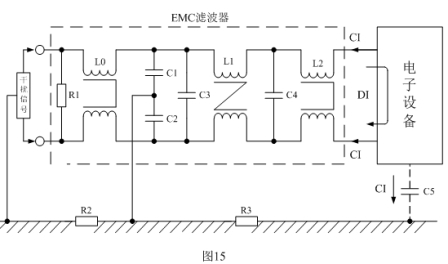 圖15與圖14相比,多了一個L0低通電感濾波器,目的是為了提高對外來傳導干擾信號的抑制能力。如果只考慮提高抑制本電子設(shè)備干擾的能力,可把C1、C2的連接位置移放到電源線的最前端,即:盡量靠近測試儀表的接入處,抑制干擾效果會更顯著。需要檢查電子設(shè)備對外來電磁干擾信號的抑制能力,可在電源線輸入端輸入一個干擾信號,然后檢測電子設(shè)備被干擾影響的程度,如:電視機出現(xiàn)行掃描不同步等。對不同的電子設(shè)備,干擾信號也有不同的要求,這些標準制定一般都是由行業(yè)協(xié)會提出,最后由標準制定單位推薦使用。