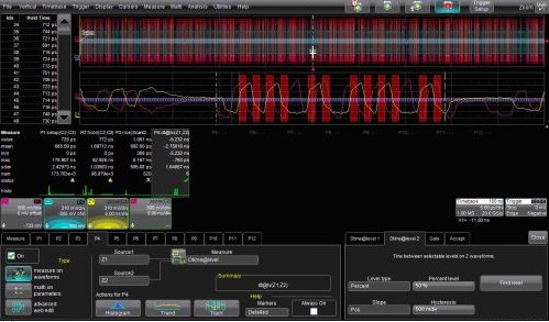 WaveScan把測(cè)量過(guò)濾中所有符合測(cè)量標(biāo)準(zhǔn)的波形累積起來(lái)形成掃描疊加的軌跡圖(圖2中間的軌跡)。這幅余輝圖包含了全部捕獲的歷史波形軌跡。我們現(xiàn)在就可以對(duì)被選擇出來(lái)的整個(gè)波形組在掃描疊加軌跡圖上應(yīng)用測(cè)量參數(shù)進(jìn)行測(cè)量。你也可以在被選擇波形的縮放軌跡上應(yīng)用測(cè)量參數(shù)進(jìn)行測(cè)量。