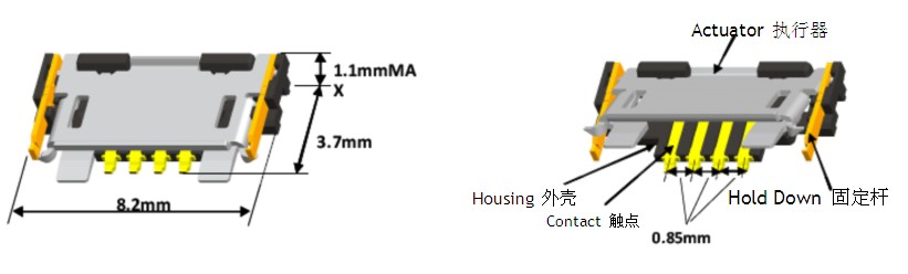 該連接器為0.2毫米(錯位排列)連接間距,帶有0.4毫米導(dǎo)向位。目前可提供11針和29針,計劃最多達81針。連接器高度為0.9+/-毫米。其外殼材料為熱塑塑料(UL 94V-0), 固定調(diào)整片和連接器的銅合金無鹵素。作為底部接觸型產(chǎn)品,因此可最為廣泛地適用于掀蓋式執(zhí)行器,很方便進行關(guān)門操作。就連接器規(guī)格而言,連接器可通過帶有外殼開槽結(jié)構(gòu)的耳式電纜分割結(jié)構(gòu)提供電纜預(yù)持功能。要求的電纜厚度是:0.2毫米+/-0.03