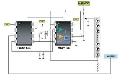圖2是采用了升壓轉(zhuǎn)換器(MCP1630)的恒流配置方案,由8位MCU提供靈活的時(shí)鐘信號(hào),電流設(shè)定點(diǎn)可由編程設(shè)定,以適應(yīng)不同的LED模塊、調(diào)光功能,并利用外置的傳感器提供閉環(huán)的溫度控制。