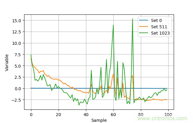 分別對設(shè)置為0,511,1023三種情況測量100次電阻。統(tǒng)計(jì)相應(yīng)的均值,標(biāo)準(zhǔn)差。