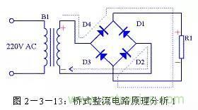 由圖2-3-13可以看出在電源正半周時,B1次級上端為正,下端為負,整流二極管D4和D2導通,電流由變壓器B1次級上端經(jīng)過D4、R1、D2回到變壓器B1次級下端;由圖2-3-14可以看出在電源負半周時,B1次級下端為正,上端為負,整流二極管D1和D3導通,電流由變壓器B1次級下端經(jīng)過 D1、R1、D3回到變壓器B1次級上端。R1兩端的電壓始終是上正下負,其波形與全波整流時一致。