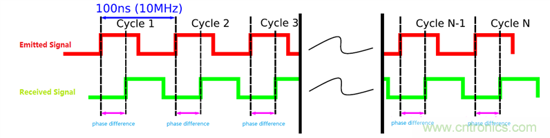 實(shí)際應(yīng)用更多的是相位偏移法。如圖4所示,基于ToF技術(shù)的接近與距離傳感器典型框圖主要有兩部分構(gòu)成,紅外光發(fā)射器和返回光接收器。發(fā)射器發(fā)射一連續(xù)高頻調(diào)制光信號(hào)(如10MHz),該調(diào)制光遇到障礙物后被反射,少部分反射光被接收器接收。比較發(fā)射光信號(hào)與接收光信號(hào)如圖5所示,其相位差隨著距離的變化而變化,距離越大相位差越大,通過(guò)處理電路提取相位差并通過(guò)計(jì)算便可得出障礙物的距離信息。