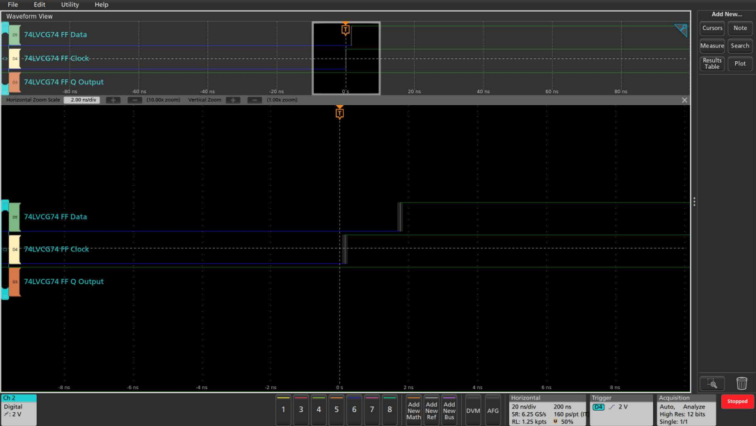 乍一看,如圖7所示,觸發(fā)器似乎按預(yù)期工作。數(shù)據(jù)信號(hào)在時(shí)鐘上升沿之前已經(jīng)穩(wěn)定了幾納秒,并且在時(shí)鐘邊沿之后保持穩(wěn)定了幾納秒。從時(shí)鐘邊沿到Q輸出的傳播延遲大約是6納秒。