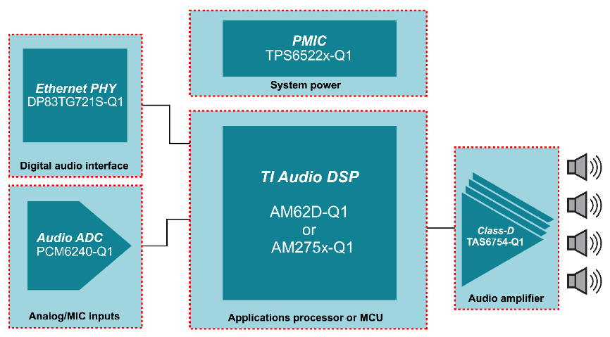 嵌入式處理器更高的器件集成度有助于簡(jiǎn)化音響系統(tǒng)設(shè)計(jì)。例如,AM62D-Q1 處理器和 AM275x-Q1 MCU 高度集成的汽車級(jí) SoC 采用 TI 的 C7x DSP 內(nèi)核、存儲(chǔ)器和元件,旨在幫助您通過(guò)單個(gè)器件滿足外部功能安全要求、信息安全要求和音頻網(wǎng)絡(luò)要求。